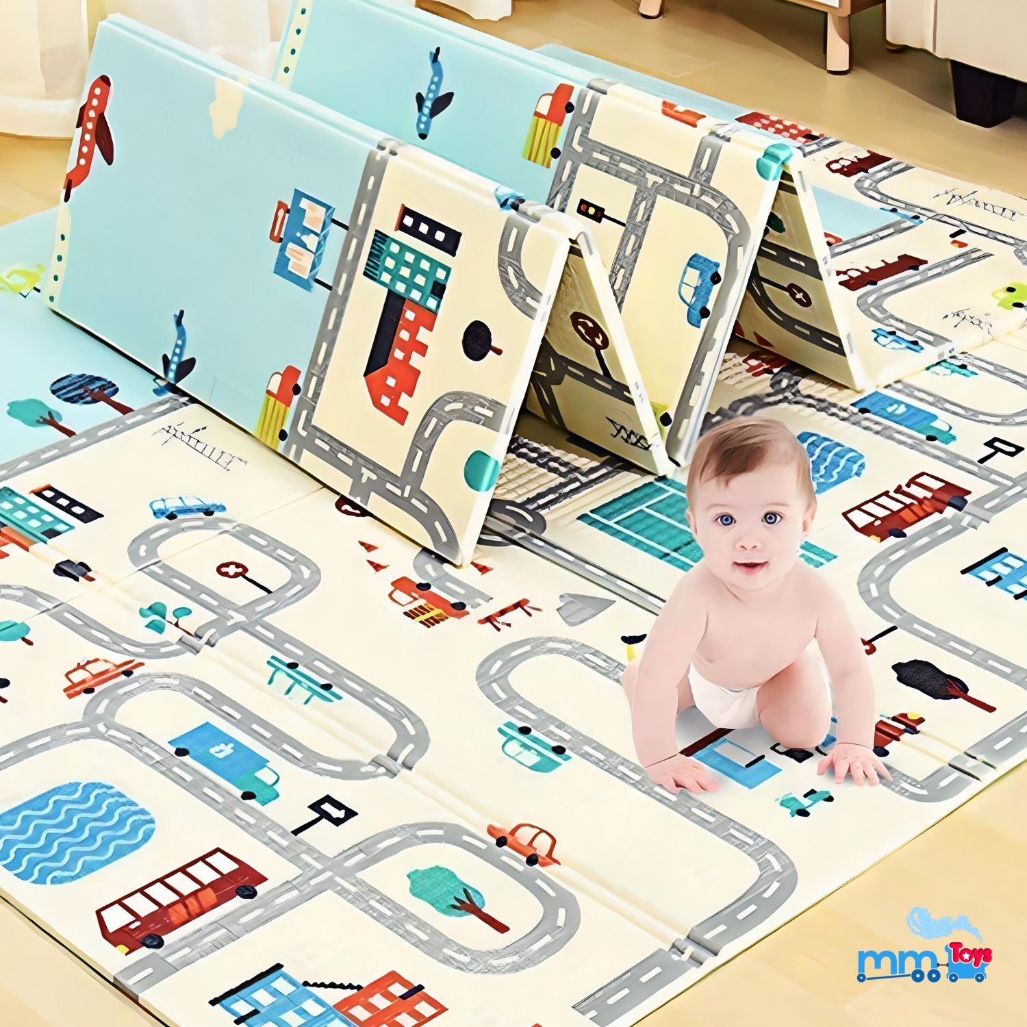 The MM TOYS Large Crawling Play Mat is perfect for kids to play on! It's double-sided and waterproof, making it easy to clean and durable. It folds easily for storage, and comes in various colors. Let your child enjoy endless hours of fun and exploration with this play mat.