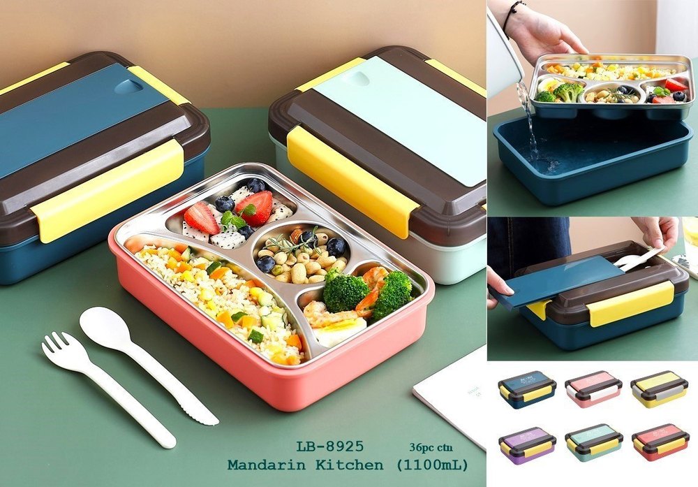 MM TOYS Lunch Box - 4 Compartments, Stainless Steel Inner, Spoon, Fork - Ideal for School and Office -Color May Vary