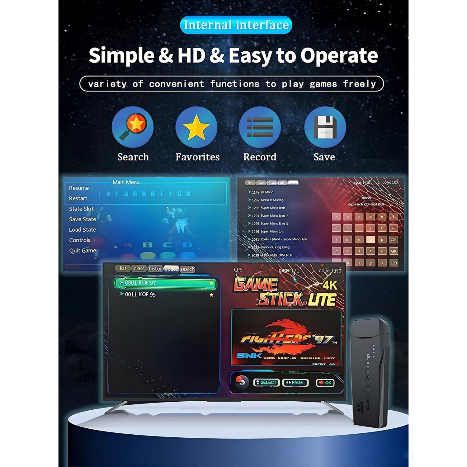 - Package Contents: Comes with 2 wireless controllers, 1 game stick, 1 power cable, 1 warranty card, and 1 user manual.